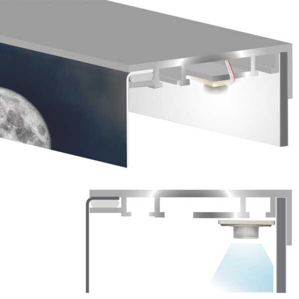 Se ilumina el rótulo perimetralmente con led’s especiales que produce unos resultados impresionantes en combinación con la tela impresa.